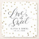 Chic calligraphy "love is sweet" script with Faux gold glitter dots, modern and elegant, personalize with couples names and date, great paper coaster for weddings, bridal showers, baby showers or any special event.