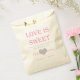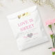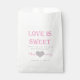 A custom favor bag reading "Love is sweet. Thank you for sharing our special day." Personalized with the bride and groom's names written over a heart, and the wedding date. Perfect for favors, candy buffets, and more!