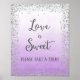 Poster print for Love is Sweet wedding sign with faux silver glitter design and ombre purple watercolor background.