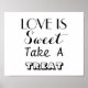 A black and white script wedding sign with text which reads "Love Is Sweet Take A Treat"; to display with candy favors at the wedding reception. Feel free to customize the words on the print to any of your choice at no extra cost. A simple sign which can be framed in a fancy or plain frame to suit your wedding décor.