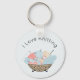 Fun keychain features knitting bowl illustration with skeins and balls of yarn and curved customizable "I love knitting" top text