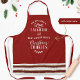Attractive red festive Holiday apron with fun phrase "All you need is Love, laughter and -your name/family name/business name- Christmas Cookies" in a mixture of hand written calligraphy and block typography. Bottom with festive stripe pattern in red, gold and white. Coordinating cookie swap party invitations, cookie decorating party invitations as well as Christmas baking gift tags.