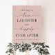 Simple Blush Pink This Way To Love Laughter & Happily Ever After Reception Sign. This modern minimal foam sign board is simple classic and elegant with a plain solid background color and a pretty signature script calligraphy font with tails. Shown in the new Colorway. Also, optional custom photograph on the backside. Available in several color options, or feel free to edit the colors from within the editor (click customize further while personalizing).