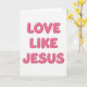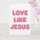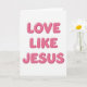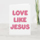 This greeting card features the phrase “LOVE LIKE JESUS” centered on the front in large, rounded pink letters. The text looks puffy and 3D, like inflated balloons, with gentle highlights that make it seem glossy. Each letter has a soft pink color that shifts slightly from darker edges to lighter centers. The background is plain white, so the message stands out right away and feels calm and focused. There are no characters or extra objects—just the words filling most of the space. The overall feel is warm and encouraging, with a simple reminder about loving others. It’s a sweet choice for someone you care about 💕❤️. Hope it helps you share a little extra love on Valentine’s Day.