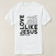 This white t-shirt features a powerful message about Christian love. The word "LOVE" is printed vertically in large, bold black letters on the left side. To the right, a passage reads: "A NEW COMMANDMENT I GIVE TO YOU THAT YOU LOVE ONE ANOTHER JUST AS I HAVE LOVED YOU. YOU ALSO ARE TO LOVE ONE ANOTHER LIKE JESUS". Below this central text, "JOHN 13:34" is printed in a smaller black font, indicating the biblical source of the quote. This shirt serves as a reminder of a core teaching of Jesus.