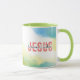 Coffee, tea mug depicts a modern abstract watercolor background with shades of blue and green. It features a powerful inspirational Christian quote, "Love Like Jesus."