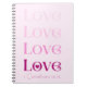 The Love Love Love Notebook features "Love" four times, with the first one very faint and the last one very dark, on a light pink background. The text under the last "Love" reads "1 Corinthians 13:13," which is one of the great Bible verses about love.