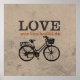 Vintage-style poster with typographical saying: "Love Makes Life a Beautiful Ride." Design features an old-school bicycle. Perfect gift for bicyclers, bike-riding enthusiasts, newly weds, Valentine's day or any time you want to say "I love you." Comes in a variety of sizes and finishes.