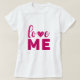 This design features the phrase “love ME” in a bold and expressive style. The word “love” is written in lowercase, while “ME” appears in bold uppercase letters, creating a strong visual contrast. The letter “o” in “love” is replaced by a pink heart filled with tiny heart shapes, adding a sweet and affectionate touch. The entire text is pink against a black background, giving the design a modern and striking appearance.