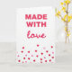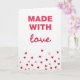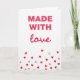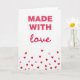 This greeting card features a wide field of bright white space that feels open and calm, letting the message read like a quiet note between two people 🥰. Near the center, the words “MADE WITH” sit in uppercase magenta letters, set in a sturdy sans‑serif style that stands out clearly against the white. Directly beneath, “love” appears in a smooth, flowing pink cursive that softens the look, like a gentle signature added with care ❤️. The two lines are stacked and centered, creating a simple focal point that draws your eyes in without crowding the design. Along the lower area, a sprinkle of small paper hearts drifts downward, suggesting a sweet exchange, like little tokens left behind after a kind gesture. The hearts alternate between ruby red and rose pink, and each one shows a faint shadow that makes it look slightly lifted from the surface. Everything is evenly lit, so the colors stay crisp and the tiny shadows remain easy to see. The bottom section is dotted with scattered hearts in red and pale pink, each with a thin gray shadow on the white background.