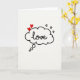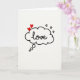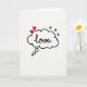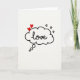 This card shows a simple white background with a large thought bubble outlined in black, like a quiet daydream floating in open space. Inside the bubble, the word “love” appears in smooth, flowing black lettering, centered and easy to read 🥰. A trail of three small black circles drops beneath the bubble, shrinking as they go, as if the thought is rising from someone just out of view. Two solid red hearts lift from the bubble’s upper-left edge, leaning outward like a sweet little secret shared between two people ❤️. On the right side, three star shapes balance the design, each outlined in black with a soft gray fill for a gentle glimmer. The wide white space around everything keeps the focus on the hearts, stars, and the single word, making the scene feel calm and intimate. The hearts sit slightly above the bubble’s curve, while the stars cluster at the opposite side, with crisp black outlines and flat red and gray fills.
