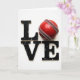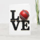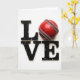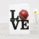This card shows the word “LOVE” arranged in chunky black 3D wooden letters, with a deep red cricket ball standing in for the “O,” like a sweet nod between two people who share the same sport ❤️. The scene sits on a bright white background, and the gentle, even lighting makes the letters and ball feel close and tangible. Each black letter has small white speckles across its surface, adding a lightly worn texture that softens the stark contrast. The cricket ball’s rich crimson tone draws the eye, and its white and dark maroon stitching curves neatly around it, suggesting care and attention in every detail 🥰. The overall layout stays simple and centered, so the message reads instantly without any clutter. There’s no extra scenery—just the quiet pairing of love and the game, like an inside joke between partners or friends. The text is formed by the physical letters themselves, with the black “L,” “V,” and “E” flanking the red ball “O” across the white space. Subtle shadows fall beneath each letter and the ball, grounding them on the surface while keeping the background bright and open.