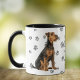 This mug for the Airedale Terrier Dog owner features an artist's portrait of a beautiful Airedale Terrier. The image is printed twice, and between them is an oval with the black text that says "Love my Airedale Terrier". The oval and dog images are placed on a white background sprinkled with paw prints. You may easily change the text to something else, or personalize it, if you'd like.