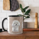 This mug for the Bichon Frise Dog owner features an artist's watercolor portrait of an adorable little Bichon. The image is printed twice, and between them is an oval with the black text that says "Love my Bichon Frise". The oval and dog image are placed on a tan background sprinkled with hearts and paw prints. You may easily change the text to something else, or personalize it, if you'd like.