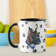 This mug for the Boxer Dog owner features an artist's watercolor portrait of a beautiful dark brown Boxer wearing a blue collar. The image is printed twice, and between them is an oval with the black text that says "Love my Boxer". The oval and dog images are placed on a white background sprinkled with black paw prints. You may easily change the text to something else, or personalize it, if you'd like.