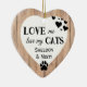 Love me love my Cats Personalized Ceramic Ornament with a rustic wooden background and a white heart in the center, a black paw print and hearts. A great ornament for all those who love their cats. Also great to give to a friend that is a cat lover. All text can be amended as needed to customize then personalize with the pets name(s)