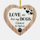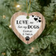 Love me love my Dogs Personalized Ceramic Ornament with a rustic wooden background and a white heart in the center, a black paw print and hearts. A great ornament for all those who love their dogs. Also great to give to a friend that is a dog lover. All text can be amended as needed to customize then personalize with the pets name(s)
