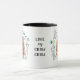 "LOVE MY CHOW CHOW" declares this mug for the Chow Chow Dog lover. Each side of the mug has a beautiful watercolor portrait of a red Chow Chow in a blue green leaf wreath. Between the two images is the text, which may be easily customized, or even removed, by you.