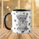 This mug for the Schnauzer Dog owner features an artist's watercolor portrait of a gray Schnauzer. The image is printed twice, and between them is an oval with the black text that says "Love my Schnauzer". The oval and dog images are placed on a background sprinkled with black paw prints. You may easily change the text to something else, or personalize it, if you'd like.
