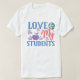 This design features a white t-shirt with the word "LOVE" at the top, a globe graphic, and the words "MY STUDENTS" at the bottom. The letters "B" are scattered throughout the design, and a purple apple graphic is also included.