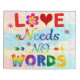 Inspirational Autism quote, Love Needs No Words, with beautiful floral illustrations and Autism puzzle pieces to support Autism children and their families.
