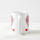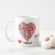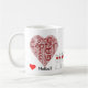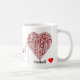 Fun "love netball" word art and netball players stick figures, with red hearts on coffee mug. Also on t-shirt and gifts. Would make a great gift idea for a netball player or fan.