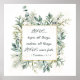 Inspirational Scripture poster depicts elegant watercolor greenery with pine, eucalyptus, blue berries and evergreens surrounding a gold frame. If features Bible Verse 1 Corinthians 13:7-8, "LOVE… hopes all things, endures all things, LOVE never fails."