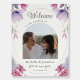Photograph Welcome Wedding Foam Board with inspirational quote Christian scripture depicts a botanical garden floral watercolor art design with simple lavender and pink flowers surrounding a modern grey oval frame featuring the couple's photo, names, and a portion of Bible Verse 1 Corinthians 13:8, "Love Never Fails."