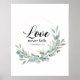 BIBLE VERSE - LOVE NEVER FAILS surrounded with a beautiful eucalyptus leaves crown painted in watercolour.
