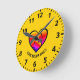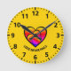 This is a vibrant yellow LOVE NEVER FAILS Colorful Hearts Clock, designed with three multicolored hearts with black outlines, one heart inside the other, set against the bright yellow background. Underneath the text reads LOVE NEVER FAILS, which is based on the Christian Bible verse in 1 Corinthians 13. This text is CUSTOMIZABLE, so you can add your name or create your own text here. The design is repeated on the back. Choose from a wide selection of hearts and Christian designs by Berean Designs. This hearts clock would make a great gift for Valentine's, Christmas and birthdays. It would also be a great gift for couples and anniversaries.