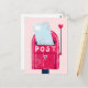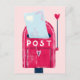 A whimsical red postbox illustration with a blue valentines / love note being sent to your loved one on a pink background