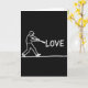 This greeting card features a chalk-on-blackboard style scene with a white-outline baseball player frozen mid-swing, his body angled forward with focused energy as if he’s sending a little affection out into the night 🥰. The background is a deep, solid black, making the rough, grainy white marks feel intimate, like a note left on a classroom board after hours. To the player’s right, the word “LOVE” appears in large, hand-drawn white letters, floating at about chest height as though the bat is about to tap it forward ❤️. The placement creates a gentle story of reaching out, with the swing reading less like aggression and more like a careful, committed gesture. The player’s outline is simple but expressive, with the bat arcing toward the text and the stance suggesting motion and intention. The lettering is slightly uneven and textured, with chalk dust edges that make each letter feel soft against the dark space. Near the bottom, a single thin white horizontal line runs across the card to ground the figure, like a baseline beneath his stride.