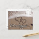 We're engaged in white script font against a photo of a sandy beach with two hearts