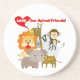 A lion, giraffe, monkey, zebra, and elephant with a red heart and text that reads Love Our Animal Friends on T-shirts, bodysuits, bibs, blankets, pillows, wall clocks, cards, key chains, mousepads,mugs, bags, stickers, and more!