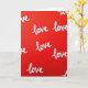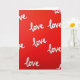 This card features a rich red background filled edge to edge with the word “love” repeated in flowing white lettering, creating an all-over pattern that feels like a steady, romantic refrain ❤️. Some of the “love” words are cropped at the edges, making it look like the pattern continues beyond the card and surrounds the viewer. The white lettering has a slightly textured look, with tiny breaks and dotted inner strokes that suggest stitched thread or embroidered trim. The spacing is loose and irregular, so your eye naturally wanders from one “love” to the next like following a trail of affectionate notes 🥰. There are no characters or scenery, but the repeated word and its gentle curves give the design a cozy, close-to-the-heart feel, like two people quietly trading sweet glances. The text sits across the entire front rather than in one centered spot, with each “love” kept in the same white color for strong contrast against the red. Under even lighting, every loop, curve, and dotted detail in the white “love” pattern stays crisp against the red field.