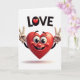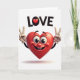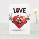 This greeting card features a big red heart character centered on a plain white background. The heart has a wide smile with white teeth, bright eyes with little highlights, and rosy cheeks that make it look friendly and happy. Simple arms come out from the sides, and both hands are making peace signs. Above the heart, the word “LOVE” appears in black block letters with a 3D look, and the “O” is replaced by a smaller red heart. A soft shadow under the character helps it feel like it’s floating just a bit off the page. The overall look is sweet and upbeat, perfect for romance, affection, or a kind note to a friend ❤️💌🍫.
