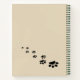 A spiral notebook with a cute illustration of a sketched dog paw print in brown with a grunge style. The letters spell out the word "Love" with the paw print in place of the letter "o". The back cover has a trail of little paw prints. Awesome for pet lovers.