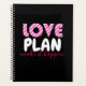 "LOVE PLAN MAKE IT HAPPEN" quote written with two different fonts in magenta and white and the word "LOVE" is illustration in pink and white diagonal striped pattern. The fonts ant the background are customizable.