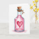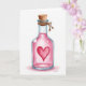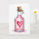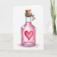 This greeting card shows a clear glass bottle centered on a plain white background, with a soft pink shadow underneath. Inside the bottle is a rose-pink liquid, and a bright red heart floats right in the middle as the main focus. The heart looks smooth and shiny, with light reflections that make it feel warm and full of feeling. A speckled cork stopper seals the top, and a simple twine bow is tied around the bottle’s neck, like a small handmade gift. The overall scene feels calm and romantic, like someone saved a loving message in a bottle ❤️💌.