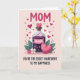 This card features a glass flask filled with deep magenta liquid, labeled “LOVE POTION” in soft pink, with a rosy heart resting on the cork as if it’s sealing in a sweet secret. A larger heart sits at the base, grounding the scene like a steady, affectionate presence ❤️. Around the flask, slender green leaves curl alongside deep red berry clusters and tiny white-and-pink blossoms, giving the setting a gentle garden feel. Small pink hearts drift upward in different shades, as though the mixture is bubbling into the air and carrying warm affection with it. A few tiny star-like sparkles are scattered nearby, adding a soft twinkle without taking over the design. Near the top, “MOM” appears in rounded fuchsia letters, centered and easy to spot. Along the bottom, the line “YOU’RE THE SECRET INGREDIENT TO MY HAPPINESS” is written in a casual hand-drawn look in dark pink, sitting beneath the illustration 🌼. The background stays a light blush tone, with the hearts and sparkles floating around the flask in the open space.