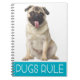 Pugs Rule! This cute Notebook features a fawn colored puppy standing on a white background. The words Love Pugs is printed in white letters on a royal blue band below the dog.
