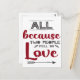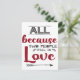This lovely postcard is perfect for Valentine's Day, birthdays, or anniversaries, and it features the caption "All because two people fell in love" in red and dark grey modern fonts on a white background, decorated with cute tiny hearts and a grey arrow.