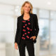 First-time purchasing one of my a design from my own shop for myself. Was thrilled with the lovely fabric (nice, soft, smooth like cotton, but it’s poly!) Fit like a dream and sits nicely in the sides and hips. Loving the smooth, nicely sewn trim at arms and neckline (see pix). Thanx for a job well done! — Di. Also thrilled that the black IS black which looks great with the snappy white fabric—the pattern is well-printed and very flattering on me. The subtle pussywillows in the design are perfect. Kudos to the print company and sewists! — Di