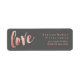 Return address labels in dark gray, with the word love and your name(s) and address printed in rose gold color.