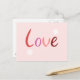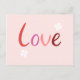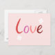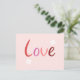 The word love in handwritten script in reds and pinks on a baby pink background with hearts top right and bottom left to create petals of a clover or flower.
