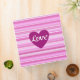 Love in handwritten script in white on a plum color heart on pinks, white and plum color stripes.