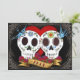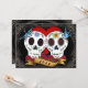 Two happy little sugar skulls, tattoo style bluebirds and roses and a banner that reads "Amor". It doesn't get any more romantic than this! Customize this invitation for your Day of the Dead themed party or wedding.