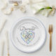 Diamond wedding anniversary party paper plate. Pretty diamond stone watercolor painting and graphic diamond wording 60th Anniversary party plate design. Reads A love so strong it is turning Diamond 60 years Congratulations Brenda and Jack Williams. Original watercolor art and design by Sarah Trett www.sarahtrett.com for www.mylittleeden.com