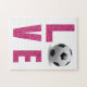 Love Soccer word design with hot pink faux sparkle letters and the "o" is replaced by a soccer ball.
