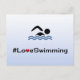 #LoveRunning. This postcard is for everyone who enjoys swimming. The text is in black with a red heart, and there is a pictogram swimmer above, on a pale blue gradient background.